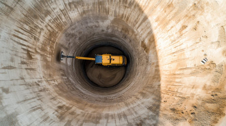Aerial view of heavy machinery digging a deep vertical hole in sandy terrain. The image captures the precision of excavation work for construction purposes, highlighting the industrial process involved in urban development.