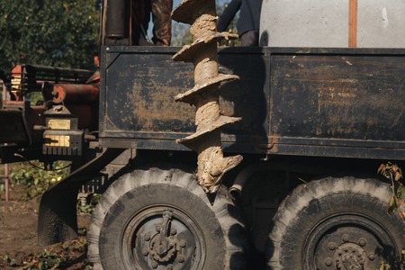 A shovel digging into the earth during the construction of a well.