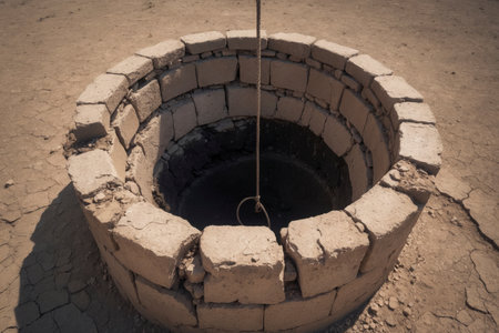An old stone well stands in the middle of a dried desert landscape. Cracks in the ground and the endless sandy horizon emphasize the aridity and the existential importance of water in this place.
