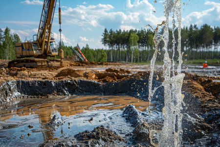A powerful drill operates in a construction site, breaking through dirt and gravel while splashing water, showcasing the energy of industrial work.