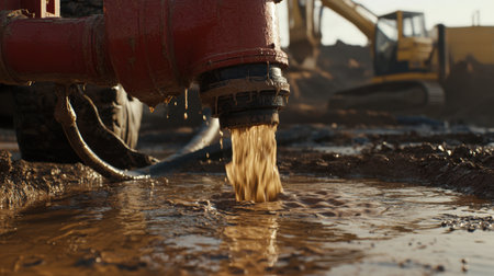 A submersible pump actively draining water from a muddy construction site, highlighting its importance and efficiency in maintaining a safe work environment.
