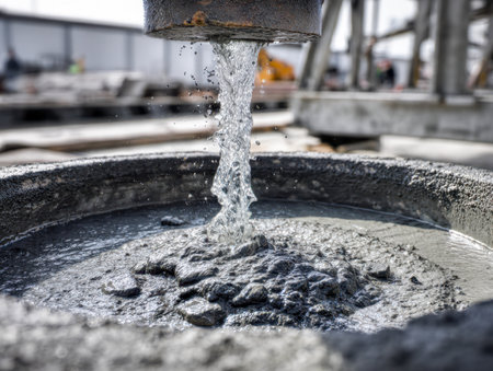 A powerful stream of liquid concrete cascades from a massive industrial pipe into a supporting container, capturing the dynamic energy of construction in progress.