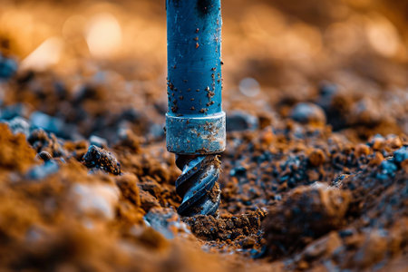 A powerful drill bit works its way into the earth, creating sparks and debris in a construction scene, showcasing the dynamic energy of the excavation process.