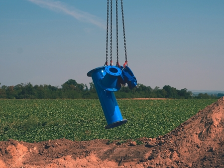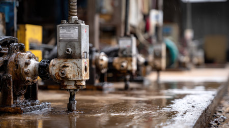 This image captures a close-up view of industrial equipment in a wet environment, highlighting a pump mechanism and surrounding pipe infrastructure, showcasing the details of machinery crucial to construction sites.