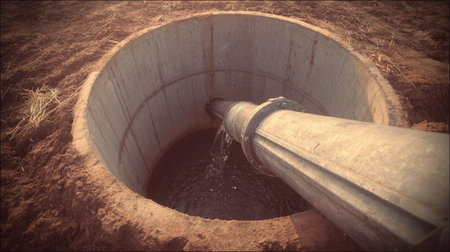 This image shows a water pump system installed in a round concrete well, surrounded by dry soil typical of rural landscapes, representing irrigation techniques.