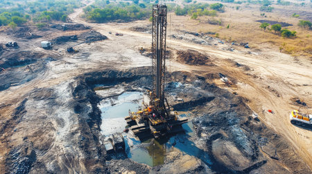 An aerial perspective showcasing an oil rig actively drilling in a remote landscape. Surrounding areas feature dry ground, patches of vegetation, and industrial activity.