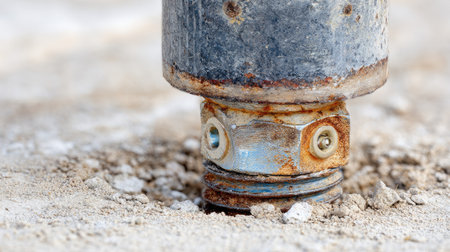 A close-up view of a spiral drill bit embedded in rocky terrain, highlighting the tool's detailed design and functionality for construction and excavation purposes.