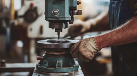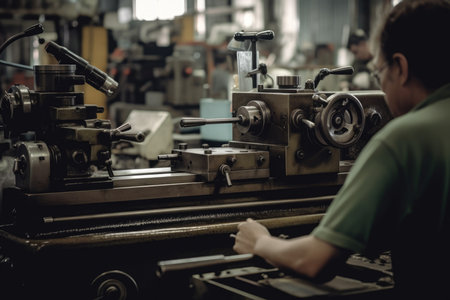 A skilled worker operates a precision machine in a workshop, showcasing the craftsmanship and technical expertise involved in metalworking and manufacturing processes.