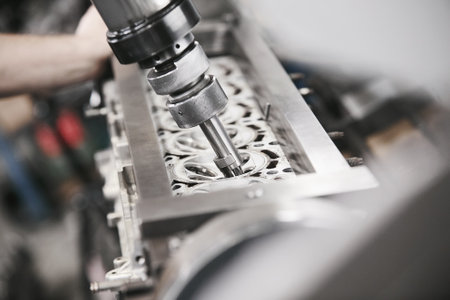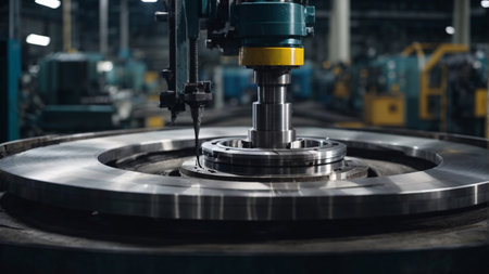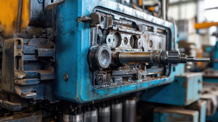 An intricate view of an industrial machine in a manufacturing facility, highlighting precision components, engineering details, and the workshop environment.