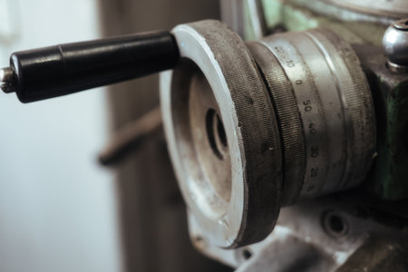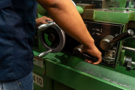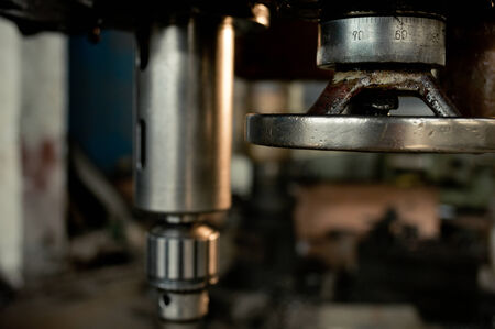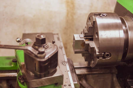 Old lathe for metal processing. Type of metal machine parts in lathe shop at factory. Industrial background. Industrial equipment..