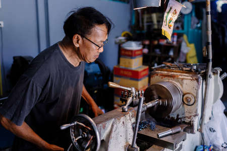 Metal engine parts being drilled, bored and lathed in a metal engineering workshop in Thailand, Southeast Asia