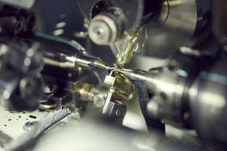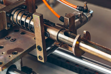 Close-up of an industrial machine part on a factory production line. The machinery is focused on a precision metal component, highlighting manufacturing and engineering.