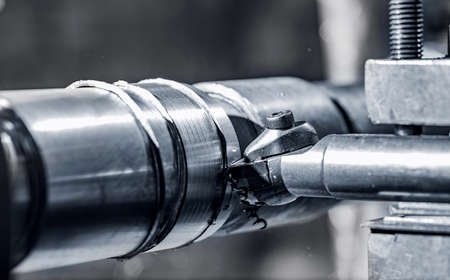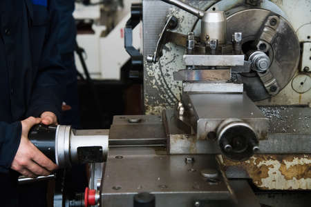 metalworking industry: working on a lathe with flying sparks. Lathe