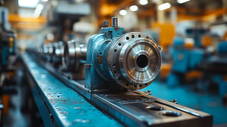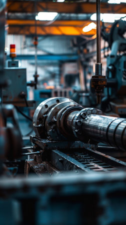 Amidst a bustling workshop, an intricate metal shaft rests on the production line, surrounded by machinery and tools. Soft, warm lights create a focused atmosphere as work continues around it.