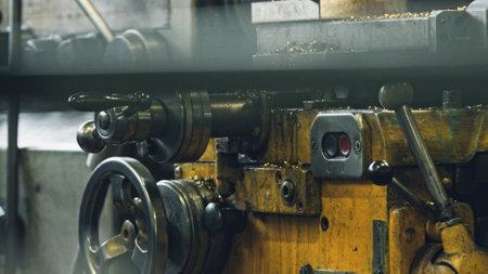 Part of lathe in workshop is close-up. Old lathe for metal processing stands in factory premises. Industrial background.
