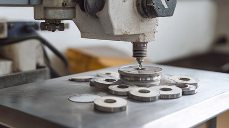A detailed view of a precision metalworking tool engaged in cutting on a workshop table, showcasing the intricate design and functionality in an industrial setting.