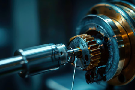 This close-up image features a precision machinery component, showcasing intricate details and modern engineering elements, highlighted by blue tones.