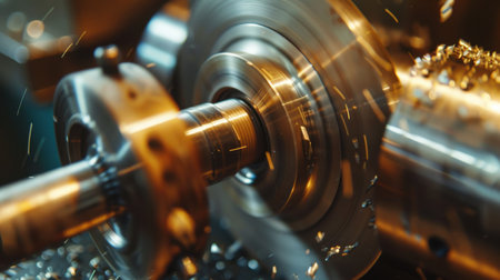 Close up view of a metal lathe machine shaping metal components in a factory workshop, highlighting intricate industrial manufacturing processes and precision engineering techniques