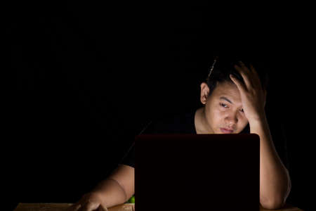 Asian man people in the dark Seeing he was thinking hard or anxious. In the eyes indicate stress and depression,Vintage mood and tone