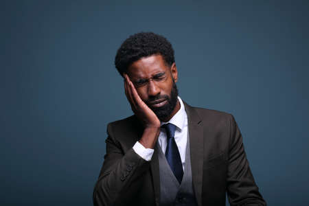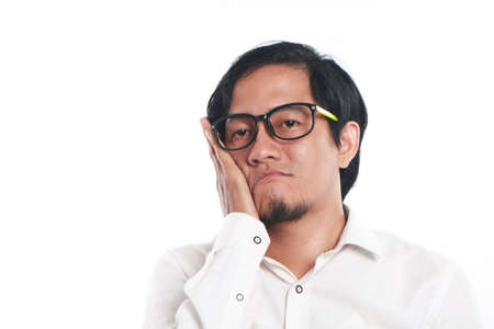 Photo image portrait of a funny young Asian businessman wearing glasses looked very bored or having toothache, close up portrait showing sad face with one hand pressing his cheek gesture