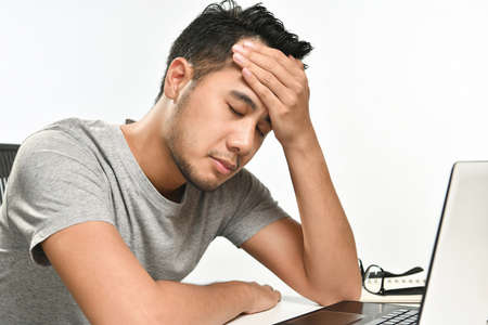 Young Asian man sleeps with tired overworked isolated on a white background.