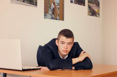 Young Businessman Resting Head on Desk and Looking Optimistic