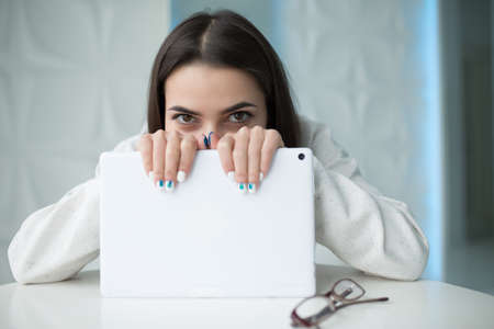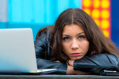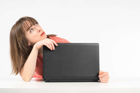 Girl next to computer is dreaming about something. Portrait of girl next to a laptop. She looks up thoughtfully. Young woman dreaming about something. Concept freelancer girl dreaming about something
