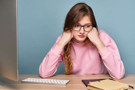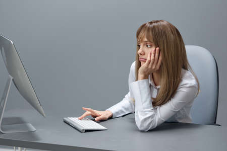 Bored pretty blonde businesswoman worker freelancer using desktop computer sitting at workplace in gray modern office. Remote Job, Technology And Career Profession Concept. Copy space