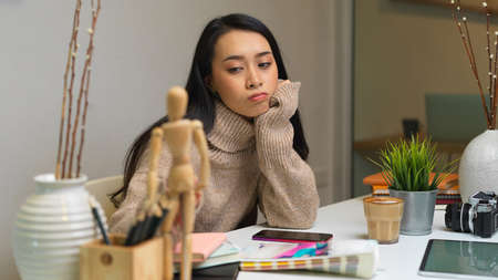 Portrait of female designer sitting at worktable with supplies and thinking about her project