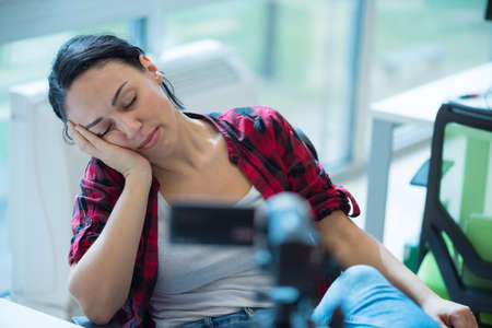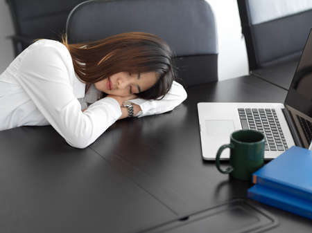 Portrait of female office worker taking nap on the table in office room, relaxing from work