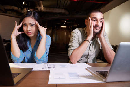 stressed businessman and woman with paperwork laptop and document sitting at a table in an office. Black and white tone