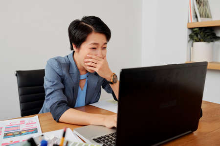 Asian young businesswoman sitting at the table and yawning while typing on laptop computer at office