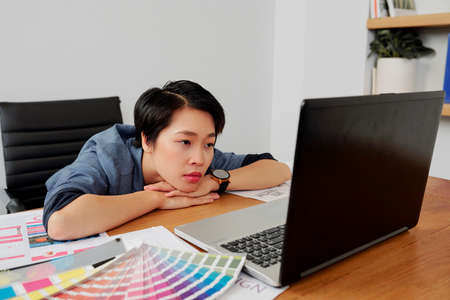 Tired web designer reading e-mail with corrections from client on laptop screen