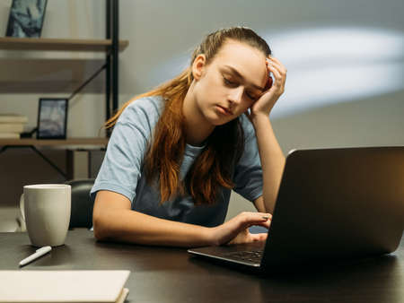 Online studying concept the young boy resting his chin on his arms staring at the laptop, having no ideas to continue his work which make him bored to work right now.