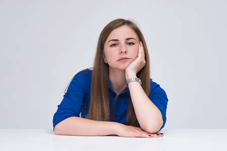 portrait of beautiful brunette girl on white background sitting at table with different emotions. She sits right in front of the camera smiling and looking happy