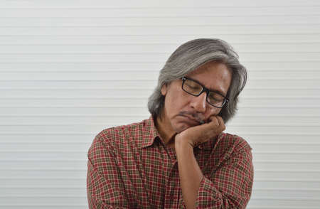 Portrait of tired asian senior businessman in red casual shirt white eyeglasses over white wall background, Business overworked concept
