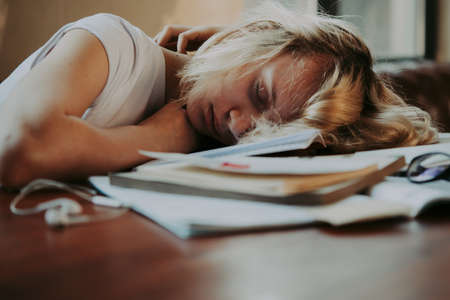 A tired teenage girl sleeping on her table while doing her school homework. Laziness and procrastination concept. Toned image