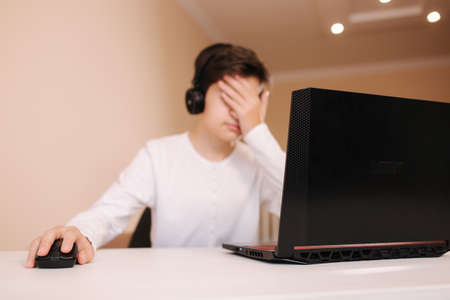Face palm of teenage steamer during the game. Boy in headphones play on laptop at home. Focus on laptop