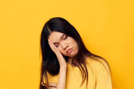 pretty brunette in a yellow t-shirt holding his head discontent yellow background unaltered