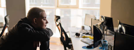 Young freelancer team serious expression deep in contemplation and no idea at office