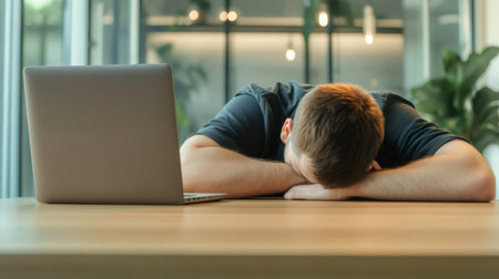 Exhausted employee sleeping on desk with head on arms, overwhelmed by stress and fatigue in modern office after working on laptop, highlighting need for better time management