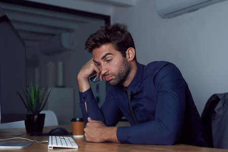 Frustrated stressed business owner or accountant sitting in an office because covid-19 has disappoint. Close business cafe shop concept.