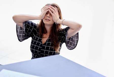 Exhausted business woman covered head with laptop. Tired female worker with a computer above her head.