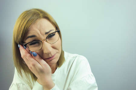 Unhappy woman suffering from toothache, tooth decay or sensitivity. Copy space for your design