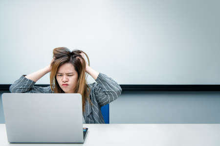 Asian woman is student,businesswoman working by computer notebook, laptop in office meeting room with whiteboard background with annoyed, displeased emotion in concept working woman,unhappy in life