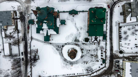 Drone view of a beautiful church in the snow. ancient architecture. snow day.