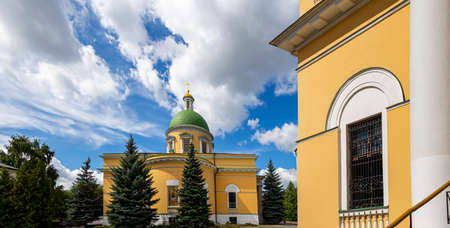 Church and bell tower built in classical style. Nineteenth century architecture. Provincial town of Borovsk in Russia.