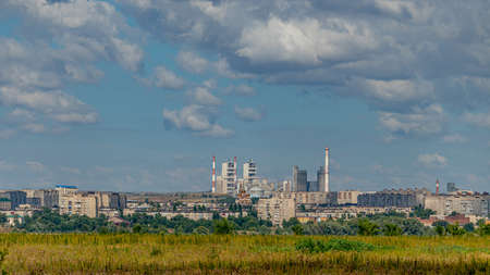 Aerial view of town, nuclear power station, thermal power station and sky. Top view.