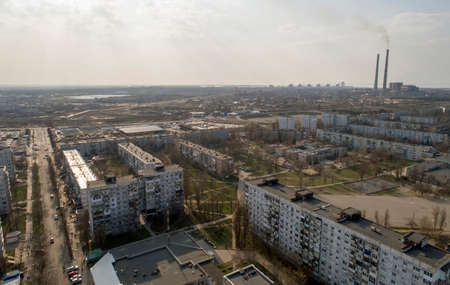 Tolyatti, Russia - April 8, 2021: Sunset over the city of Togliatti, view from a quadcopter