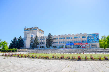 Octyabrsky, Russia - April 24, 2017: House of Culture near the central square. The legacy of Maistrenko. Construction of the Soviet era. Krasnodar Krai, Krasnoarmeisky District.